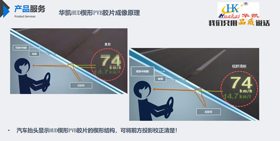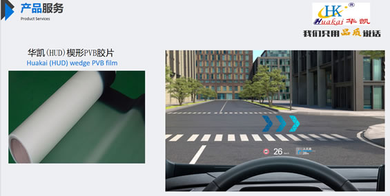 重慶華凱塑膠有限公司是一家自主研發(fā)高分子材料制造商企業(yè),經(jīng)過(guò)多年自組研發(fā),我公司成功研發(fā)新型產(chǎn)品汽車用抬頭顯示膜HUD楔形PVB膠片,是國(guó)內(nèi)獨(dú)家制造商,打破進(jìn)口壟斷國(guó)內(nèi)市場(chǎng)局面,HUD楔形PVB膠片是將普通 PVB 中間膜制備成楔型結(jié)構(gòu),利用光學(xué)反射的原理,將數(shù)字信息投射在 PVB 夾層玻璃上,然后經(jīng)過(guò)折射處理,可使駕駛員不用低頭就可以直觀地看到行車、導(dǎo)航等信息,減少駕駛員因視線遠(yuǎn)近切換而造成的分神、疲勞,將更多的精力放到觀察路面情況上,從而提高行駛的安全性。